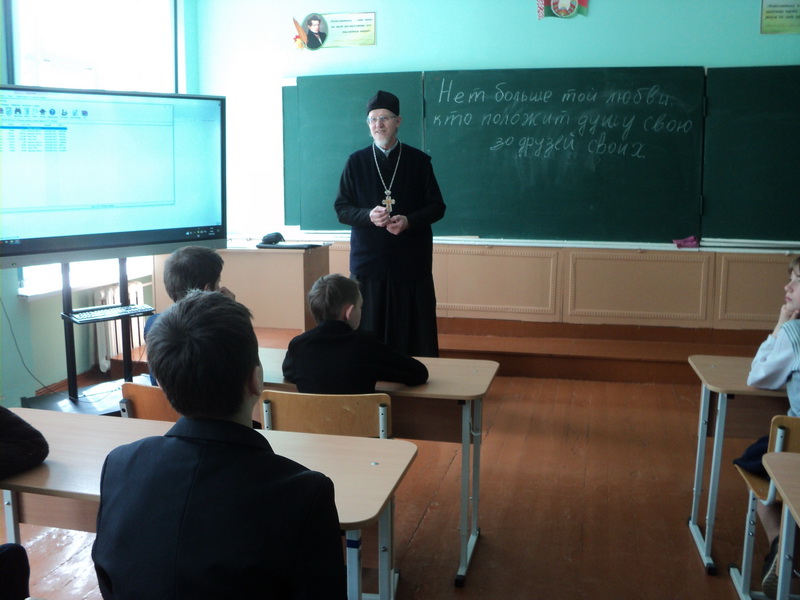 3 мая настоятель храма Святой Живоначальной Троицы аг. Деревная Слонимского благочиния протоиерей Анатолий Ежевский провел беседу с учениками 5-7 классов Деревновской базовой школы на тему: «День Победы».
