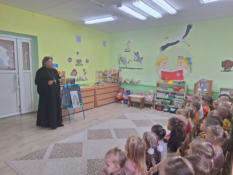 14 октября с воспитанниками младшей, средней и старших групп о празднике Покрова Пресвятой Богородицы и о Дне Матери говорили ключарь Спасо-Преображенского кафедрального собора г. Слонима протоиерей Андрей Цигель и его супруга Н.В. Цигель. Дети узнали, почему Пресвятая Богородица именуется Матерью человеческого рода и как трепетно нужно любить наших земных мам. Малыши рассматривали икону Покрова Пресвятой Богородицы и слушали рассказ о том, как Пречистая спасла от верной гибели в годы Великой Отечественной войны детей, отправленных в эвакуацию.