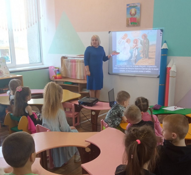 В этот же день руководитель кружка Н.О. Терешко провела беседу на тему: «Крещение Господне».Дошкольники узнали историю крещения Иисуса Христа в реке Иордан, познакомились с богословским смыслом этого праздника и традициями. Особое внимание педагог уделила правилам обращения с крещенской водой.