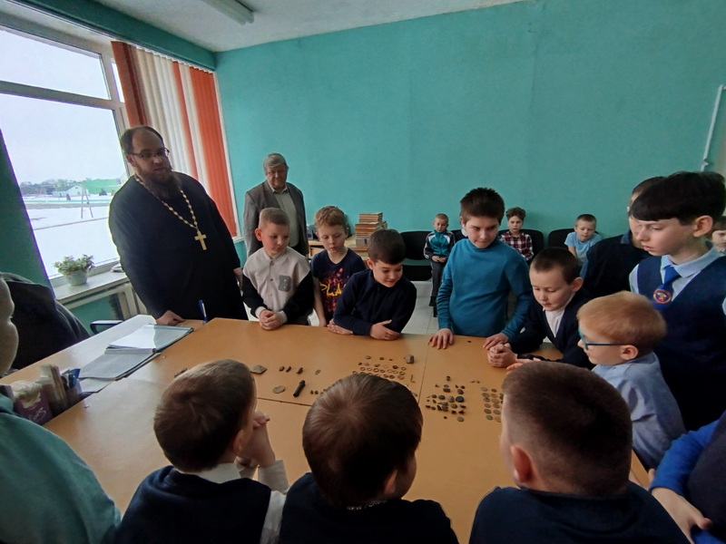 Иерей Димитрий рассказал детям о подвигах святого Александра Невского, Димитрия Донского и о тех священнослужителях, которые в годы войны приближали Победу. Также вниманию детям была представлена экспозиция из предметов древности и военного быта.