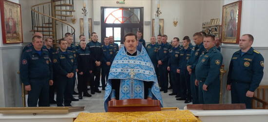 После молитвы священники поздравили спасателей и обратились с напутственным словом, а также подарили икону Божией Матери «Неопалимая Купина».