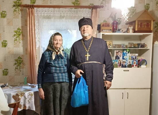 Священник побеседовал с прихожанами на душеполезные темы и вручил им помощь от прихода.