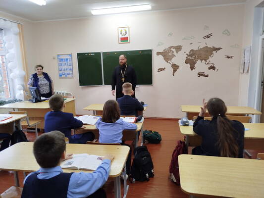Священник рассказал о таинстве Крещения: о том, что, крестившись, человек становится членом Церкви Христовой и отныне может приступать к остальным церковным таинствам. Он пояснил, что крещение необходимо человеку для спасения, и напомнил, как Господь Иисус Христос, отправляя апостолов на евангельскую проповедь, научил их крестить людей. Иерей Феодор также объяснил учащимся, кто такие крестные родители и как они должны заботиться о духовном воспитании своего крестника.В теплой дружеской обстановке священник ответил на вопросы учащихся.