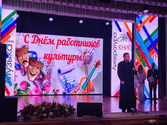 Священник поздравил работников и ветеранов культуры с профессиональным праздником, отметив, что культура в различных ее проявлениях должна воспитывать человека и направлять его к созиданию добра.