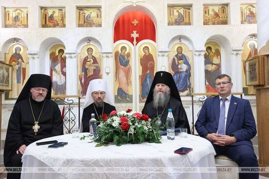 Затем состоялась пресс-конференция, участниками которой стали Патриарший Экзарх всея Беларуси митрополит Минский и Заславский Вениамин, архиепископ Новогрудский и Слонимский Гурий, наместник монастыря игумен Аристарх (Дроздов), председатель Новогрудского районного исполнительного комитета С.С. Чарковский, заместитель председателя Синодального информационного отдела Белорусской Православной Церкви О.Н. Лепешенков.