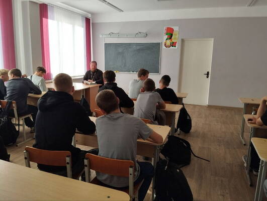 10 октября настоятель храма святых благоверных князей Бориса и Глеба г. Новогрудка протоиерей Николай Косяк побеседовал с учащимися 1 курса Новогрудского государственного колледжа на тему: «Заповеди Божии».