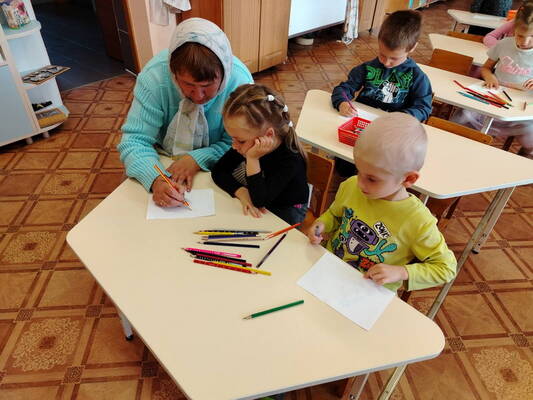 Руководитель кружка в детском саду №1 Т.Л. Селецкая повела с детьми занятие на тему: «Шестой день творения Божия». Прочитав рассказ «Спор животных», малыши узнали, каких животных сотворил Бог и какую пользу они приносят. Также они отгадывали загадки и выполнили творческое задание по теме.