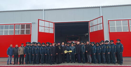 Священник поздравил коллектив спасателей с торжественным открытием нового объекта, подарил на молитвенную память икону Божией Матери «Неопалимая Купина» и окропил святой водой новый гараж и личный состав РОЧС.